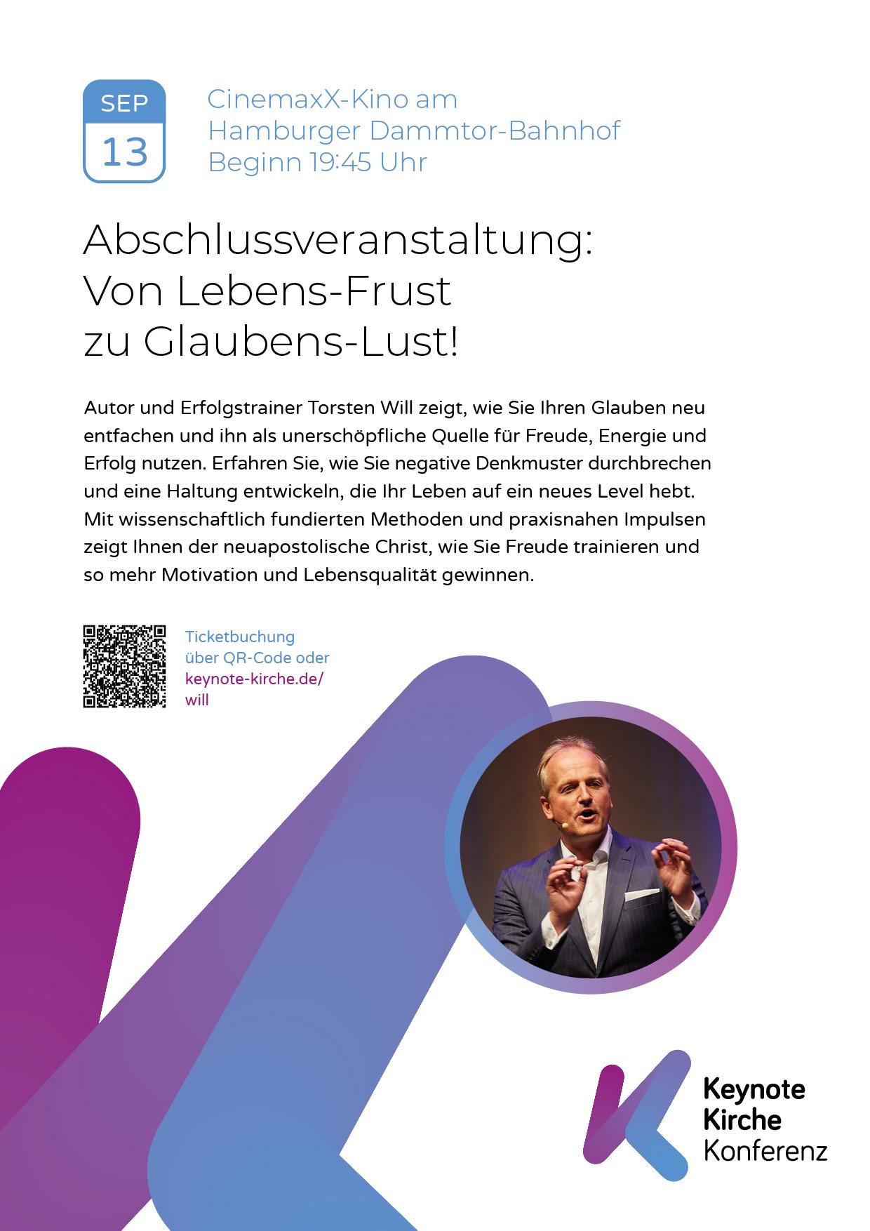 Mit der Glaubenskonferenz geht die Neuapostolische Kirche neue Wege. Zwölf Stunden Impulse und Musik erwarten das Publikum im Hamburger Kino! Speakerinnen und Speaker aus verschiedenen Lebensbereichen und mit unterschiedlichen Glaubenshintergründen laden dazu ein, sich mit Glauben und dem Leben als Christ zu befassen. Ein bunter Mix von Menschen und Themen, der dem Motto der Keynote Kirche gerecht wird: Inspirierend. Verbindend. Ökumenisch.